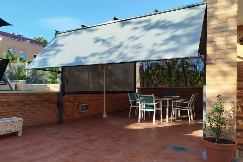 El cliente nos contactó con la necesidad de cubrir una zona exterior expuesta al sol y al viento, sin renunciar al diseño y la integración estética con la fachada. Tras analizar el espacio y las necesidades, propusimos una solución compuesta por tres elementos perfectamente combinados, formando una pérgola con toldos laterales y frontales.