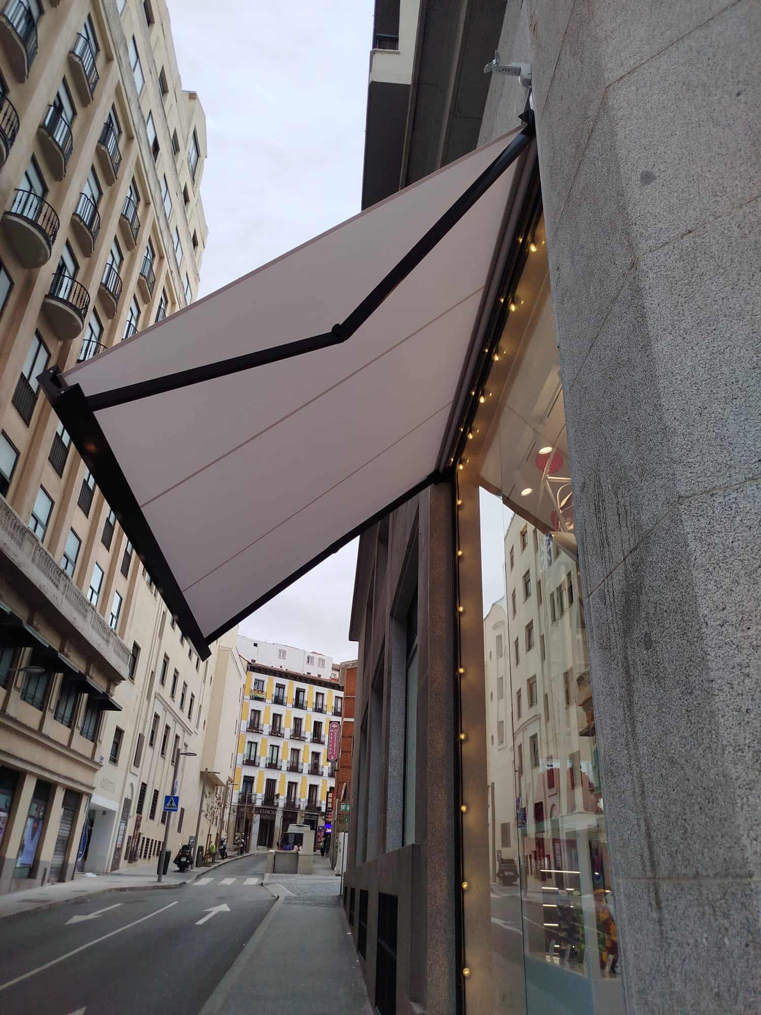 Instalación en Alehop de Gran Vía de 3 toldos cofres extensibles, lacado negro, con lona acrilica sauleda 2042 blanco, accionamiento mediante motor y mando, con sensor viento sol.