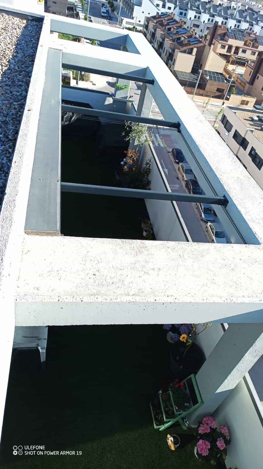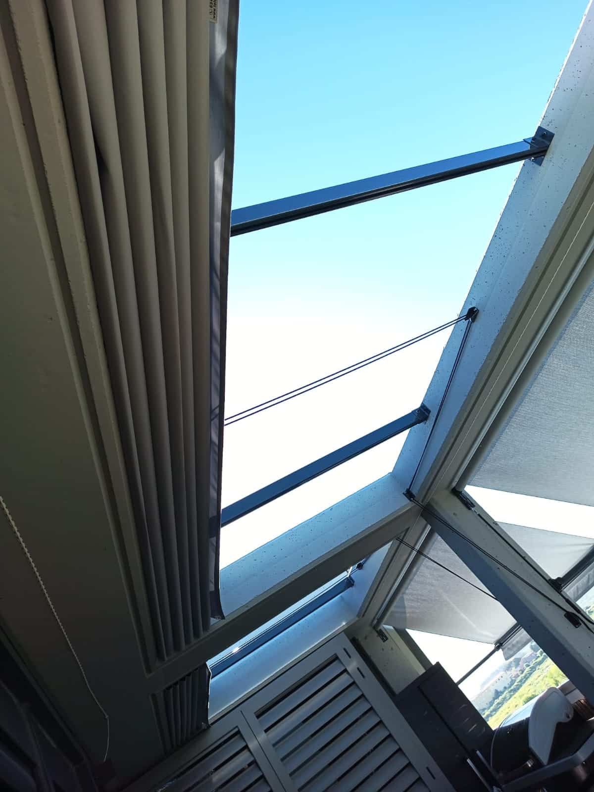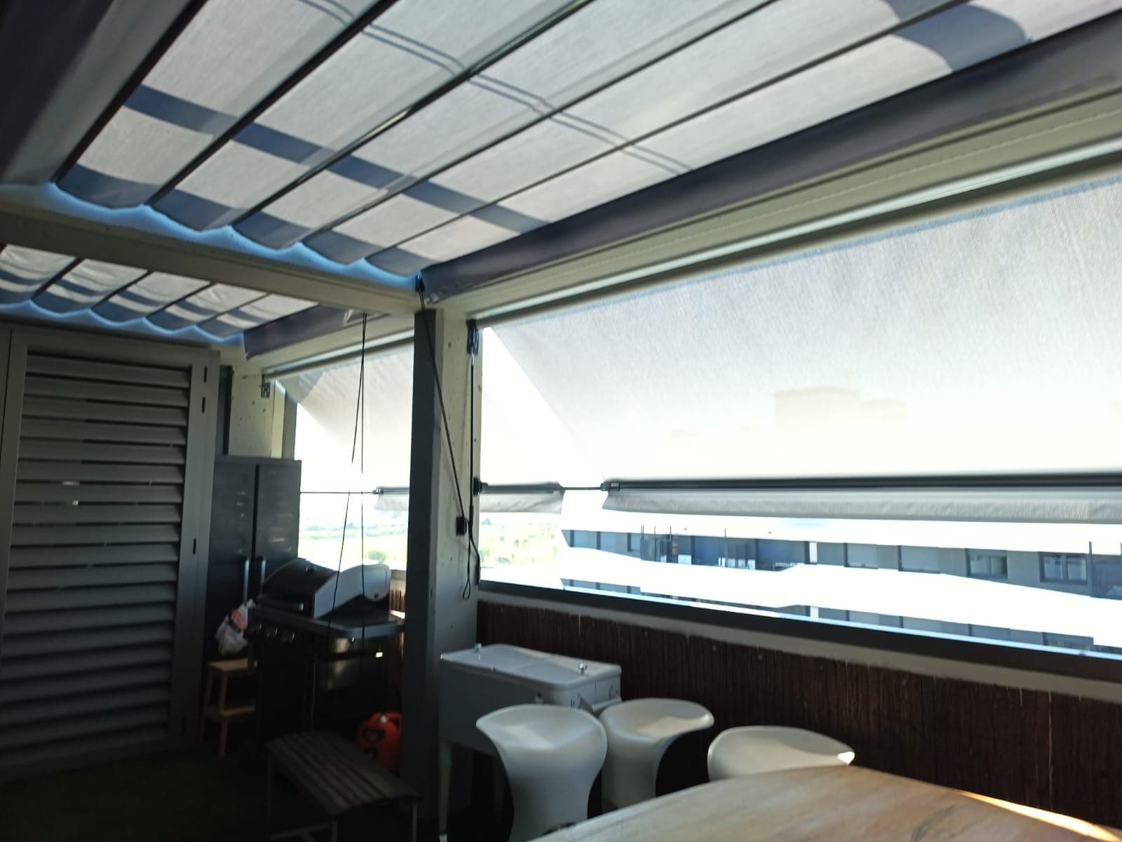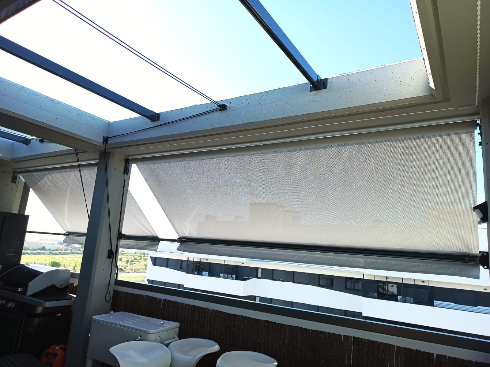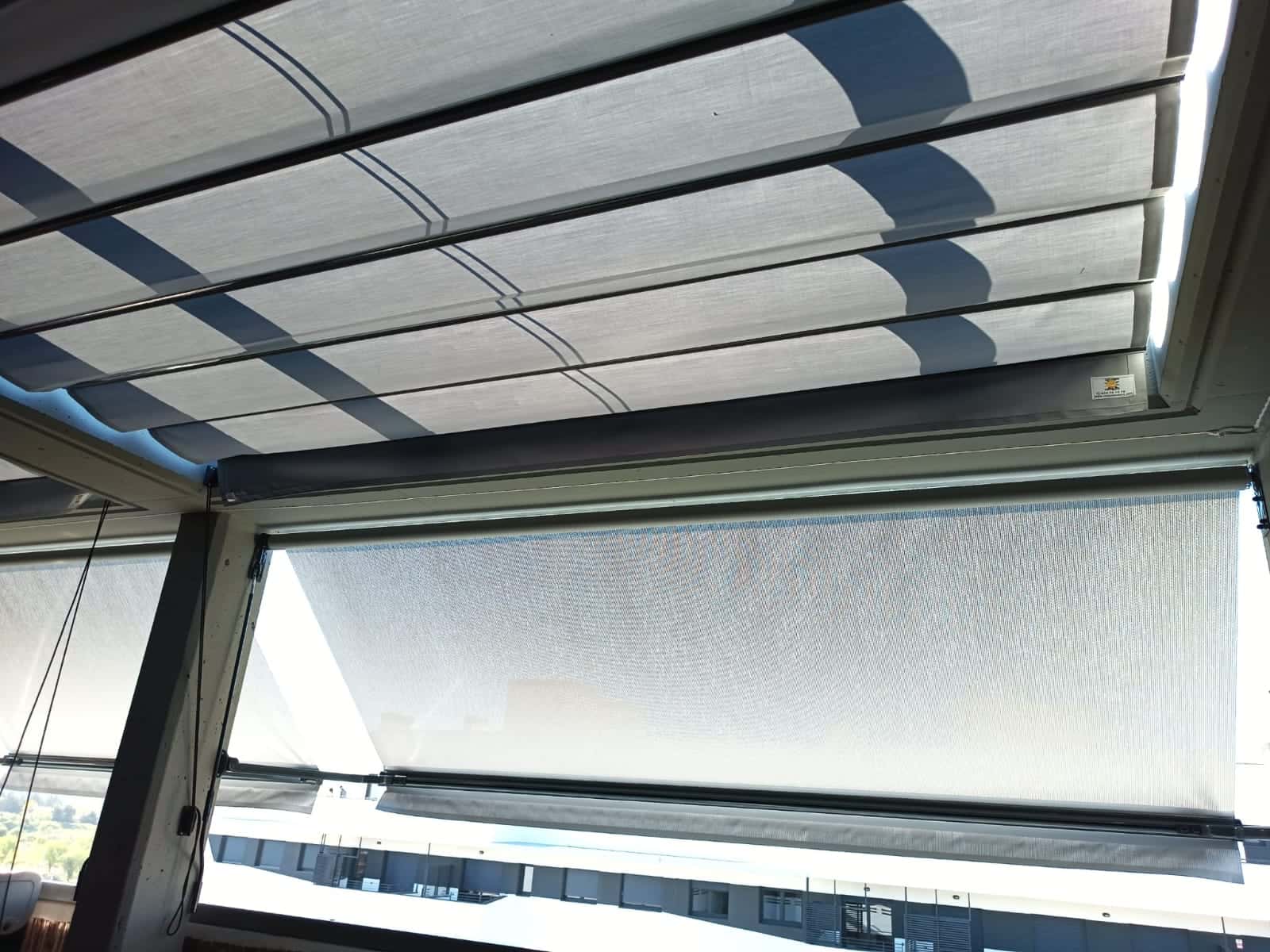 Entre paredes con guías de 80×40 y tejadillo para proteger pérgola cuando esté recogida y al frente toldos punto rectos con brazos antiviento, aluminio lacado RAL 7016 y lona acrílica Sauleda 2102 gris en las pérgolas y en los toldos lona microperforada Soltis 96 para evitar la entrada de sol y no quitar las vistas.