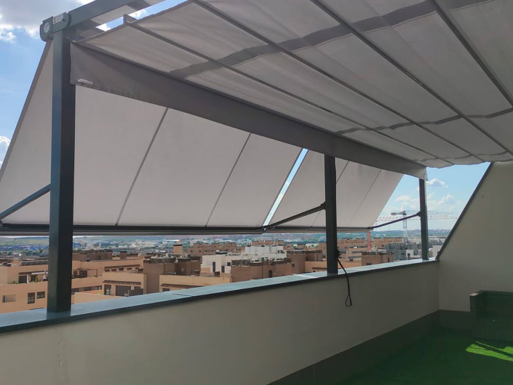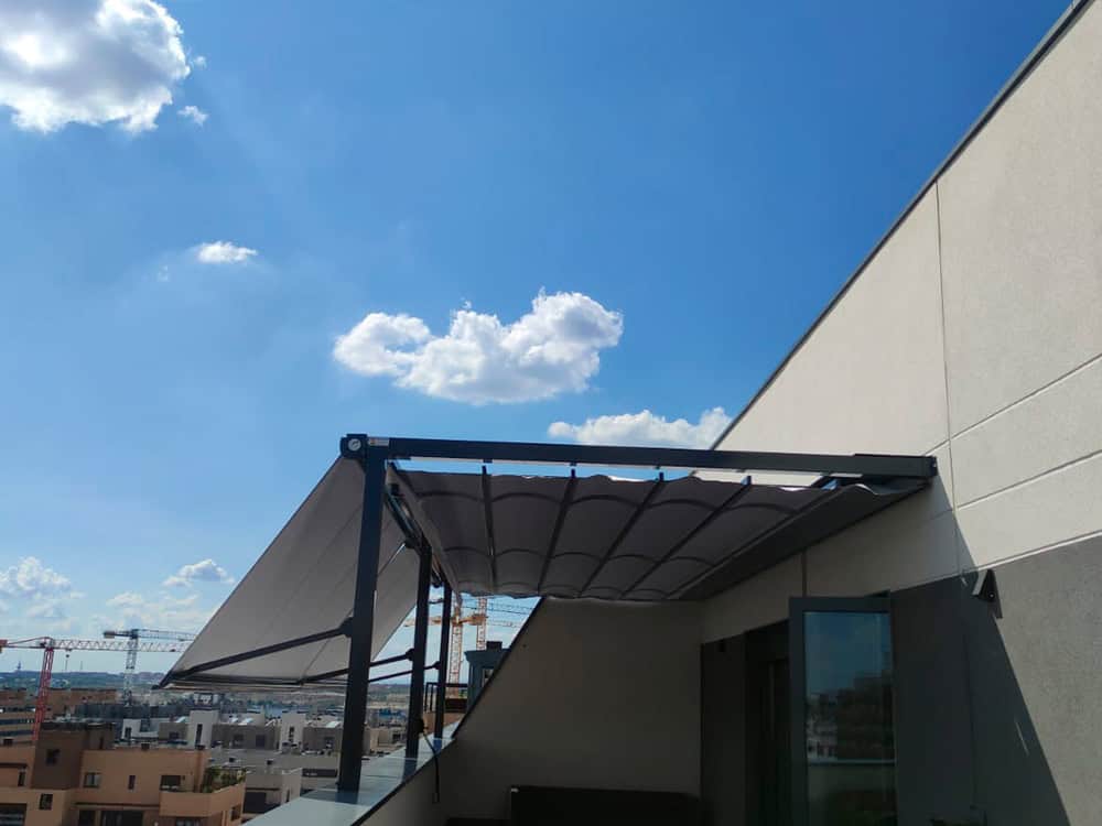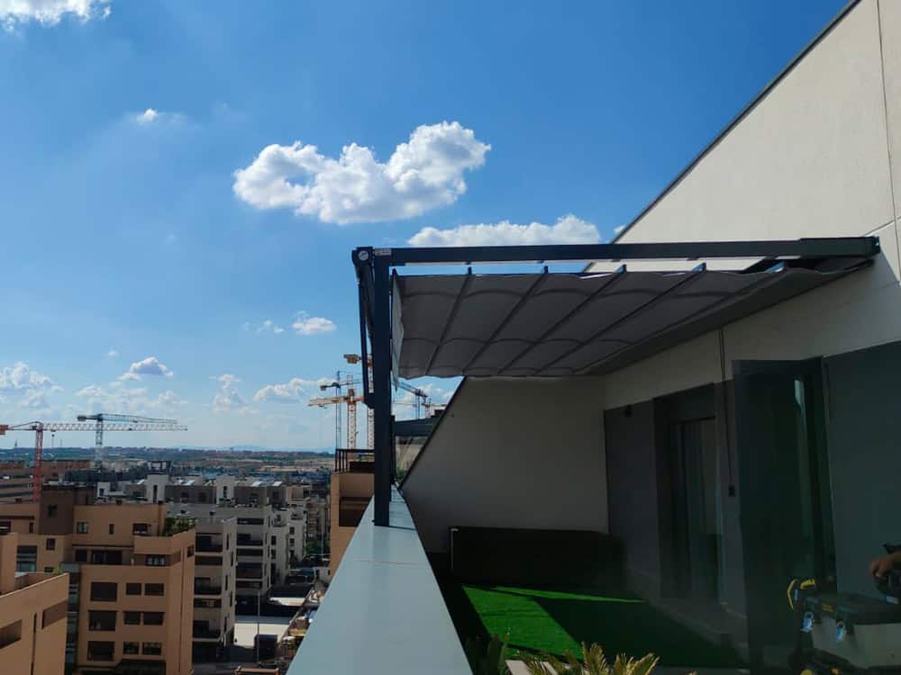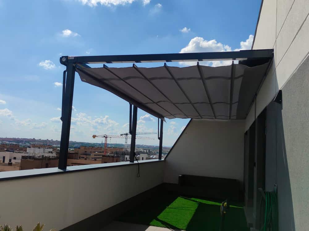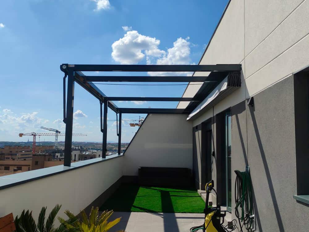 Instalación en Vicálvaro ( el Cañaveral) de pérgola 90×96 pared/portería con patas al muro,tejadillo de aluminio compacto para proteger lona y dos toldos minicofres punto recto con brazos de tensión accionados mediante motor Cherubini con mando multicanal y sensor viento sol.todo lacado en RAL 7016 y lona Sauleda.
